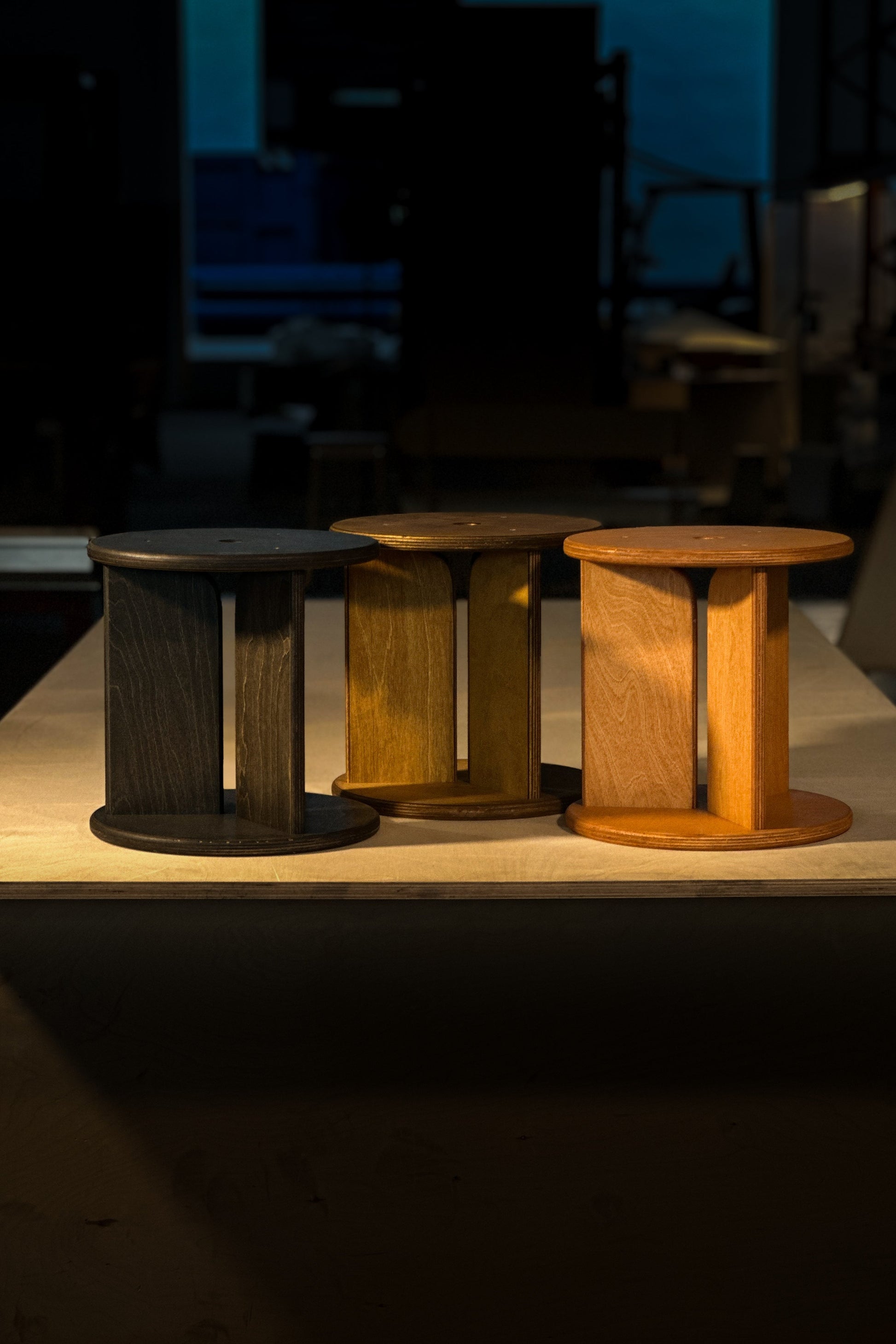 A spool-shaped stool, made to be a compact and sturdy piece. Great as compact seating for smaller spaces, or also as child-sized seating.